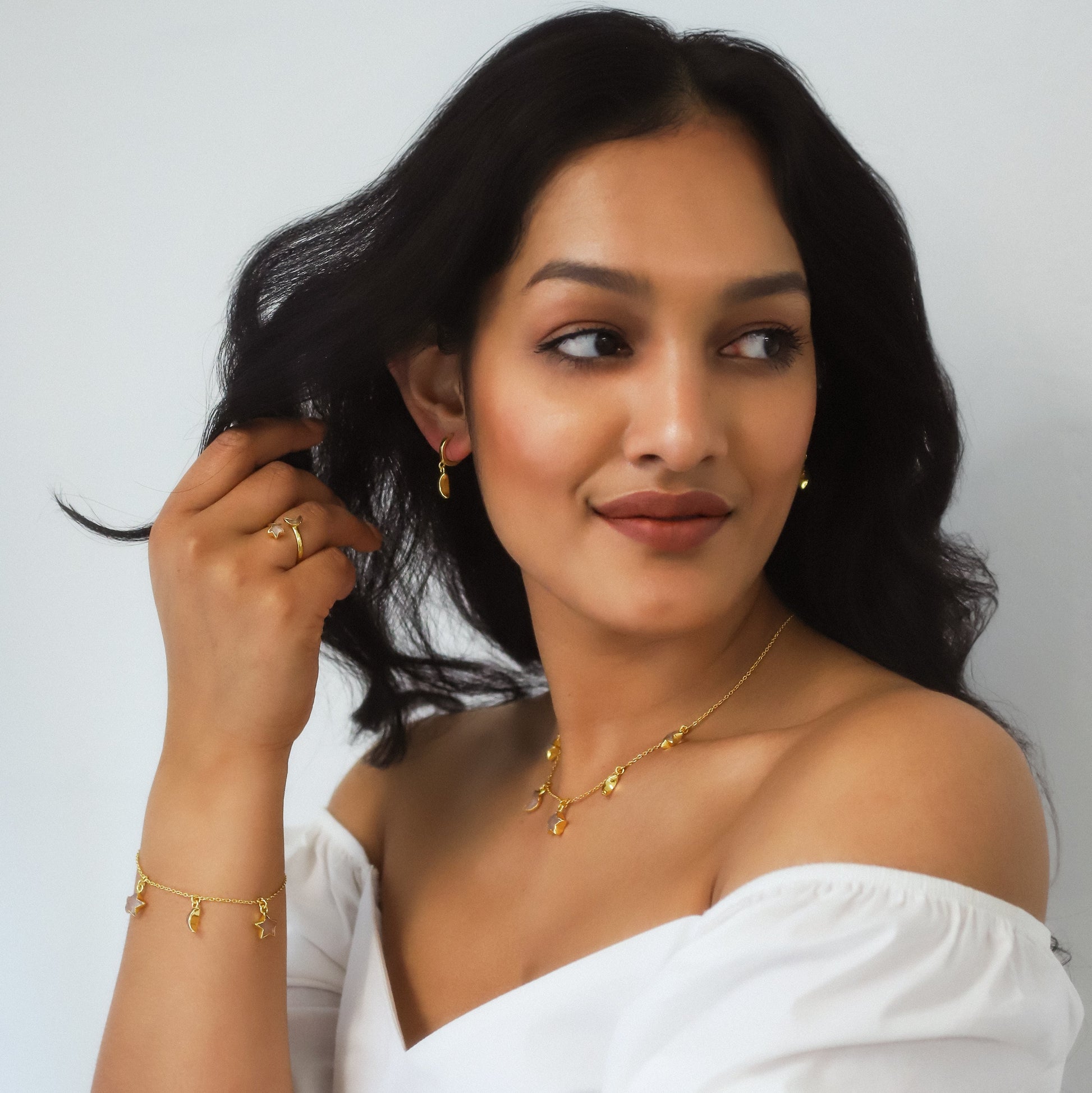 Celebrate self-love and harmony with Amelia, our absolutely stunning new raw crystal bracelet featuring enchanting rose quartz star & moon charms hanging from a gold vermeil chain.