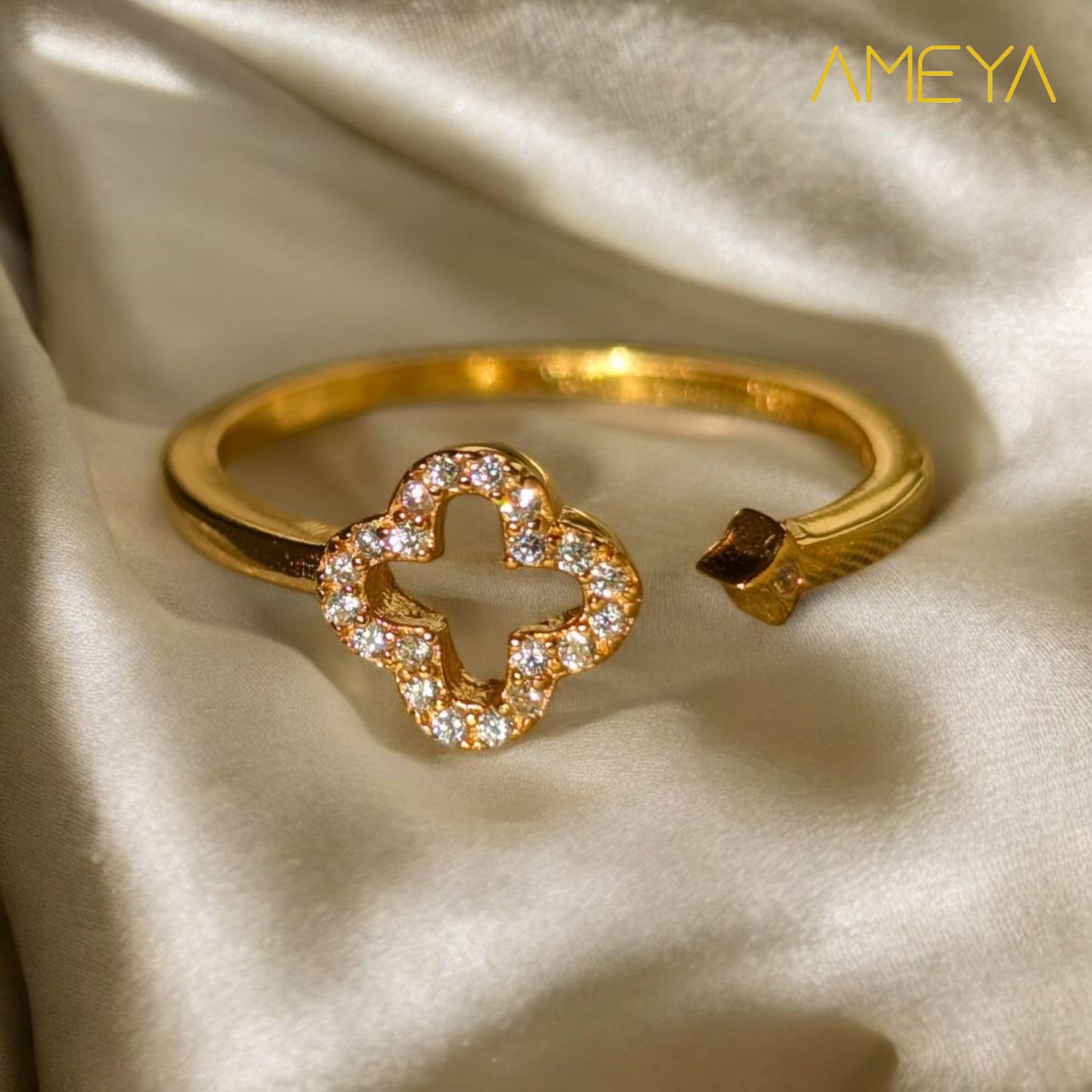 Ameya 18K Gold Plated Four-Leaf Clover Ring, Adjustable, Cubic Zirconia Crystal, Sterling Silver