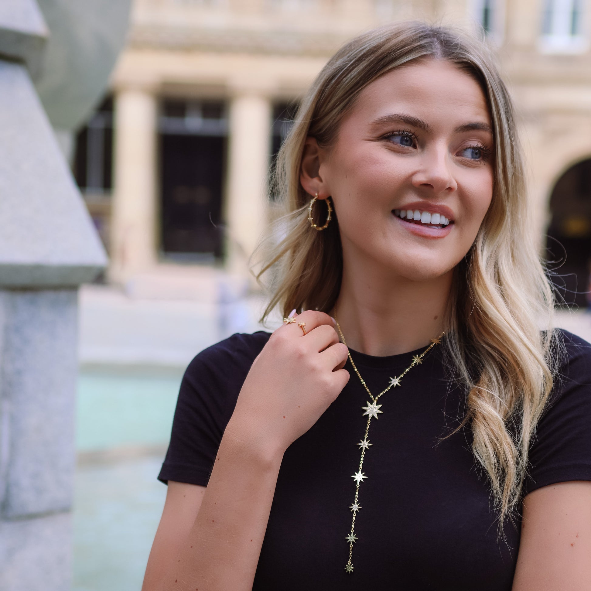The Aneira hoops are designed to be an ultra wearable earrings style with maximum impact. The star design makes them a bold addition to any look. Stack with mini hoops and studs for a gold-finish flourish to your ear stack.