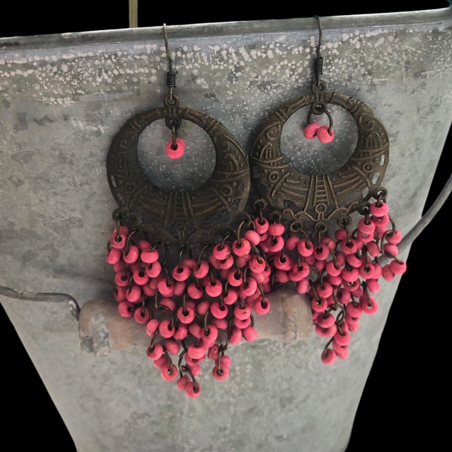 Handmade for the free-spirited fashionista, these Antic Brass Beaded Hoop Earrings will make a statement with their unique boho style. The rustic brass and pink wooden beads add a touch of nature's beauty to any outfit.